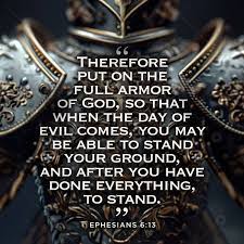 “Wherefore take unto you the whole armor of God, that ye may be able to withstand in the evil day, and having done all, to stand. Stand therefore, having your loins girt about with truth and having on the breastplate of righteousness, and your feet shod with the preparation of the gospel of peace; above all, taking the shield of faith, wherewith ye shall be able to quench all the fiery darts of the wicked. And take the helmet of salvation and the sword of the Spirit, which is the word of God. Praying always with all prayer and supplication in the Spirit, and watching thereunto with all perseverance and supplication for all saints.” Ephesians 6:13-18