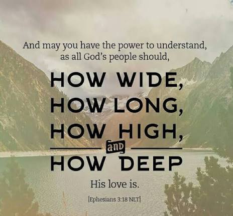 “And may you have the power to understand, as all God’s people should, how wide, how long, how high, and how deep his love is. May you experience the love of Christ, though it is too great to understand fully. Then you will be made complete with all the fullness of life and power that comes from God.” Ephesians 3:18-19